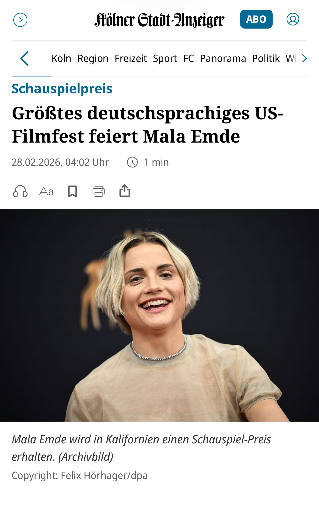 Feb. 28, 2026: Kölner Stadt-Anzeiger: Schauspielpreis: Größtes deutschsprachiges US-Filmfest feiert Mala Emde